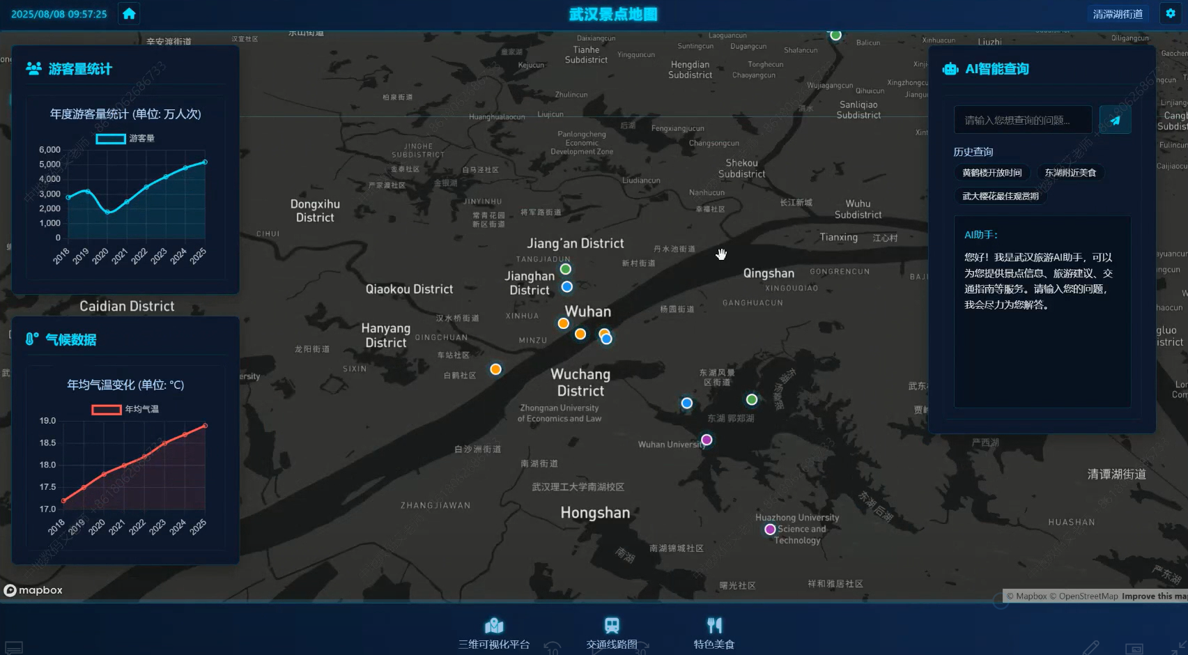 平台成功实现了武汉城市的数字化展示,通过WebGIS技术整合景点、交通、美食等多维信息,为游客提供全方位的智慧旅游服务。项目团队掌握了前端可视化与交互技术,构建了集实用性、美观性和创新性于一体的旅游信息平台。