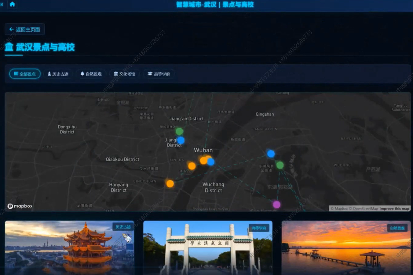 景点模块以3D武汉地图模型为基础,整合了丰富的景点信息和实用功能: