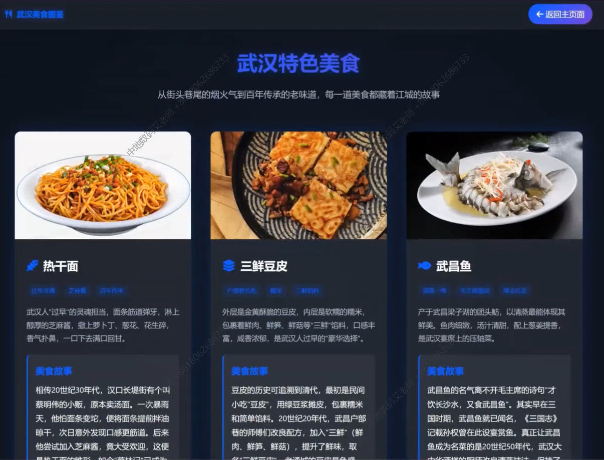 美食模块旨在介绍武汉当地特色美食,如热干面、三鲜豆皮等,通过图文并茂的方式展示:
