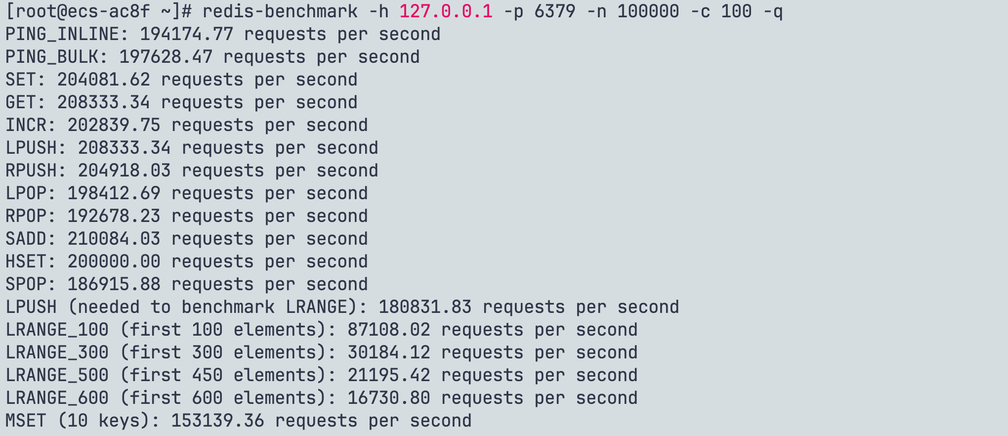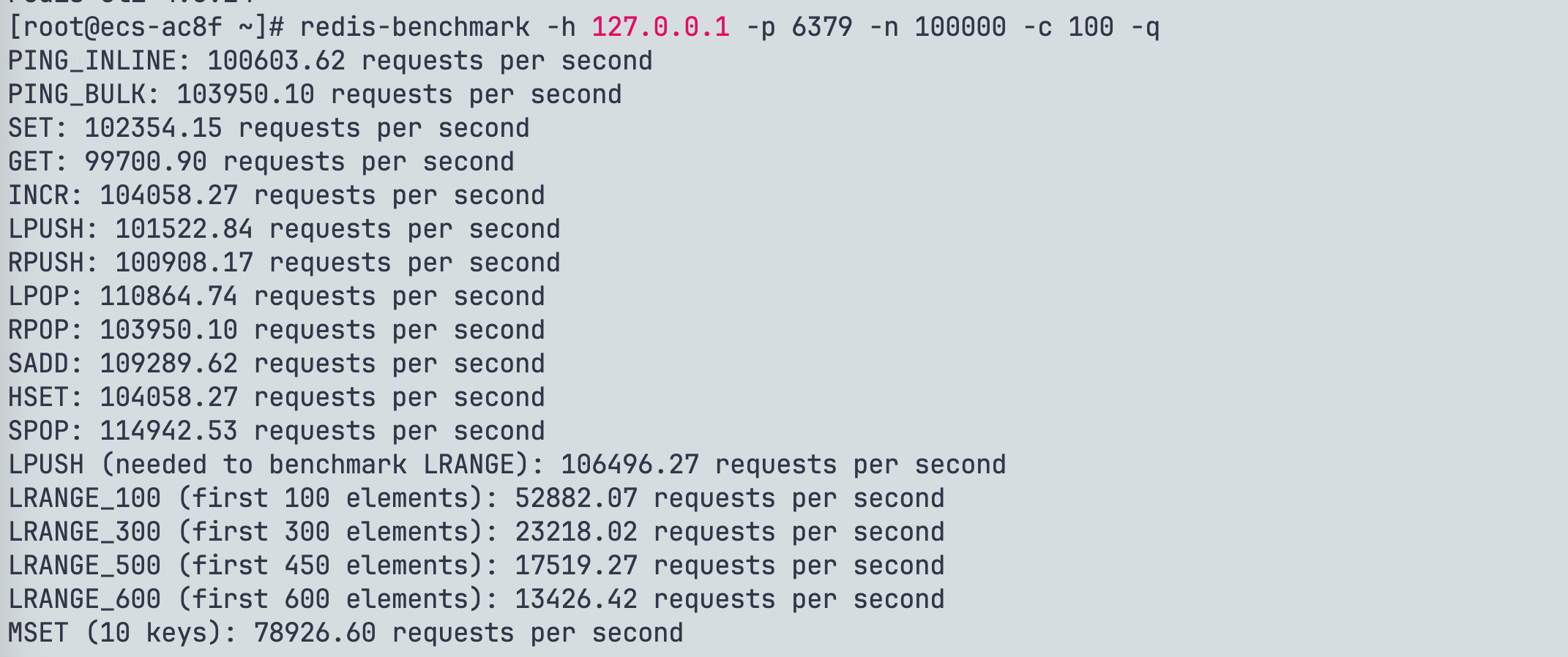 | Bash # 综合性能测试:10万次请求,100并发 redis-benchmark -h 127.0.0.1 -p 6379 -n 100000 -c 100 -q |
