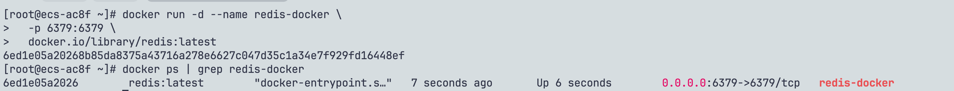 | Bash # 拉取Redis官方镜像 docker pull docker.io/library/redis:latest # 启动Redis容器(桥接模式,映射6379端口) docker run -d --name redis-docker \ -p 6379:6379 \ docker.io/library/redis:latest # 查看容器状态 docker ps | grep redis-docker |
