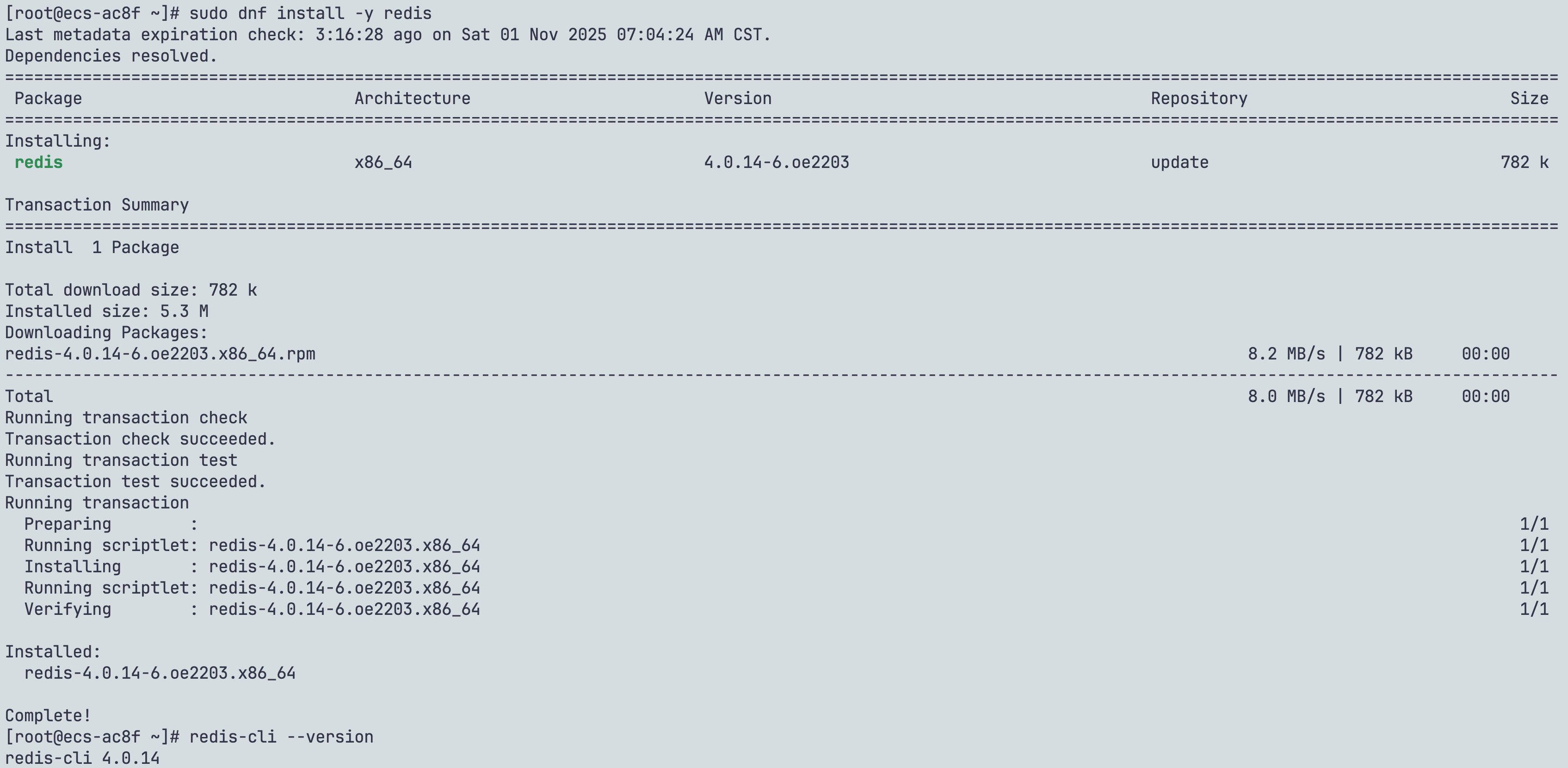 openEuler仓库里的是Redis 4.0.14版本,够用了。安装很快,800多KB一会儿就装好了。