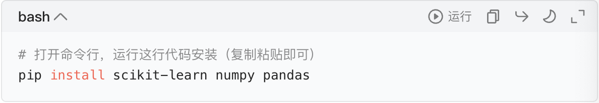 首先明确核心前提:我们学习的 转化器、估计器、ColumnTransformer、Pipeline 都来自 Python 最常用的机器学习库 scikit-learn(简称 sklearn),所以先确保你安装了必要库: