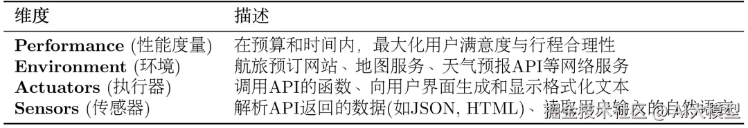 要理解智能体的运作,我们必须先理解它所处的任务环境 。在人工智能领域,通常使用PEAS模型 来精确描述一个任务环境,即分析其性能度量(Performance)、环境(Environment)、执行器(Actuators)和传感器(Sensors) 。以上文提到的智能旅行助手为例,下表1.2展示了如何运用PEAS模型对其任务环境进行规约。