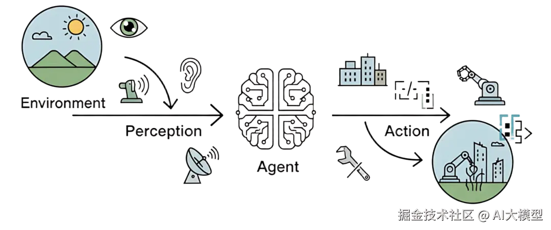 - 行动 (Action) :决策完成后,智能体通过其执行器(Actuators)执行具体的行动。这通常表现为调用一个选定的工具(如代码解释器、搜索引擎API),从而对环境施加影响,意图改变环境的状态。