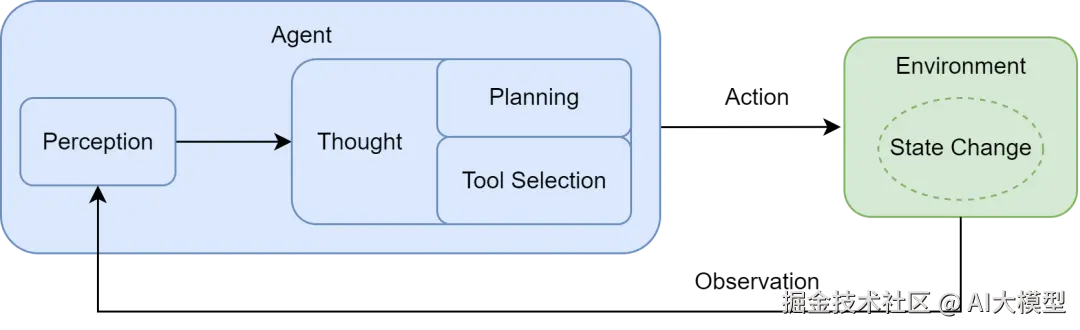 行动并非循环的终点。智能体的行动会引起环境 (Environment) 的状态变化 (State Change) ,环境随即会产生一个新的观察 (Observation) 作为结果反馈。这个新的观察又会在下一轮循环中被智能体的感知系统捕获,形成一个持续的"感知-思考-行动-观察"的闭环。智能体正是通过不断重复这一循环,逐步推进任务,从初始状态向目标状态演进。
