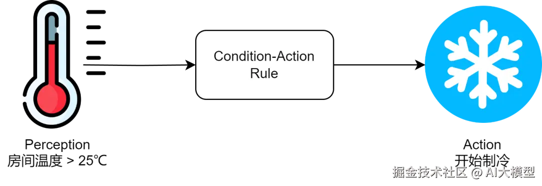 这个演进的起点,是那些结构最简单的反射智能体(Simple Reflex Agent) 。它们的决策核心由工程师明确设计的"条件-动作"规则构成,如图1.2所示。经典的自动恒温器便是如此:若传感器感知的室温高于设定值,则启动制冷系统。