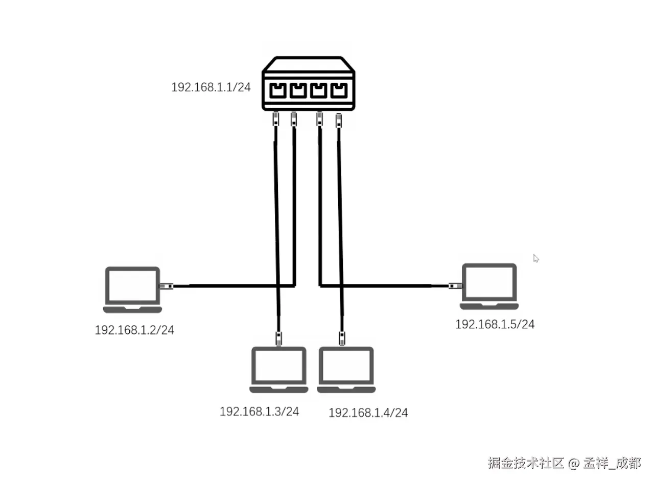 现在我们多加一些电脑,这时候一根网线肯定就不够了,我们就加入一个交换机(虚拟交换机是有 ip 的,但是现实生活中的交换机是没有 ip),如下图