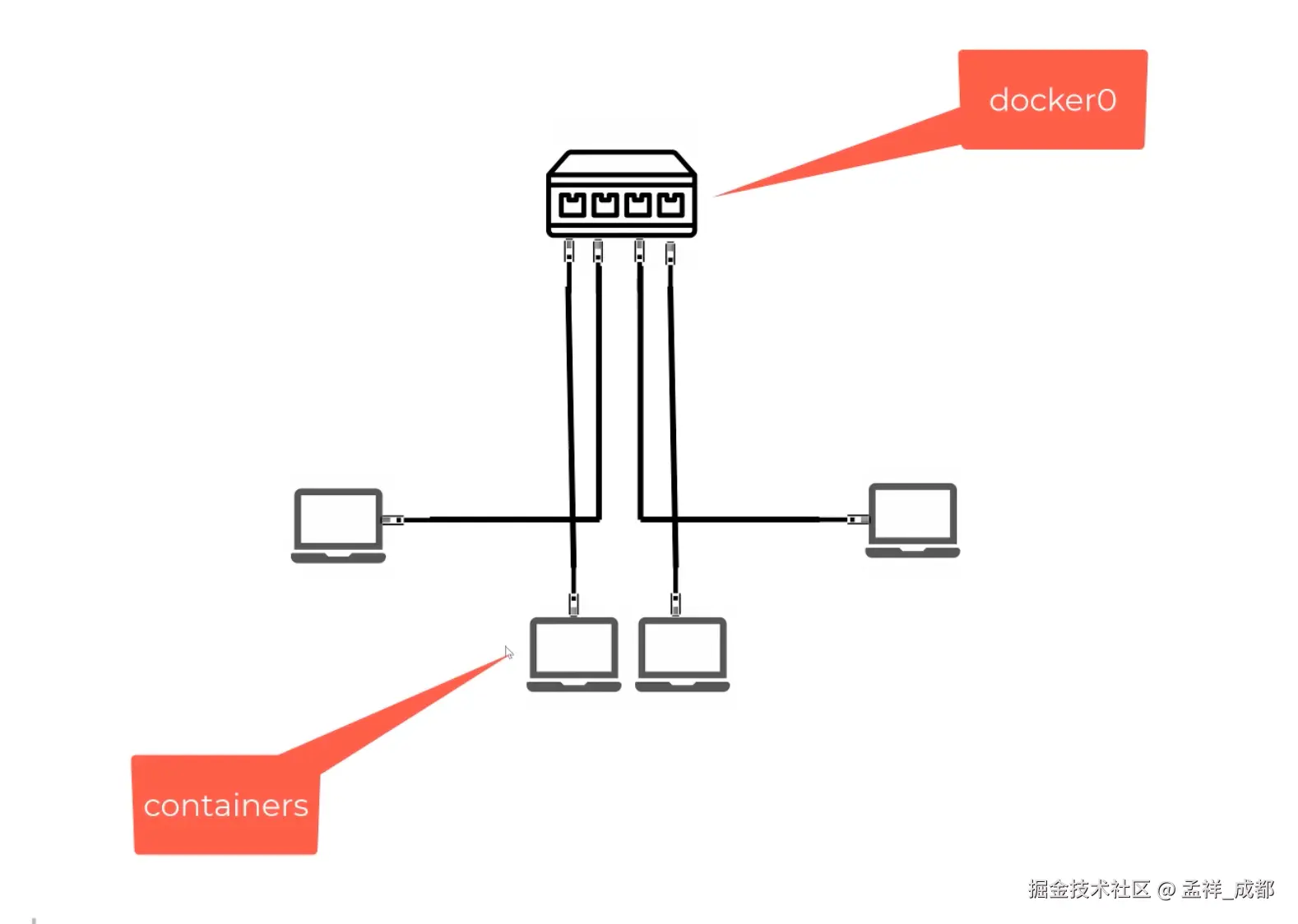 其实 docker 内部默认有一个叫做 docker0 的网桥,这个网桥工作机制就跟我们上面说的交换机类似。而容器默认情况下,会连接 docker 0 网桥。如下图: