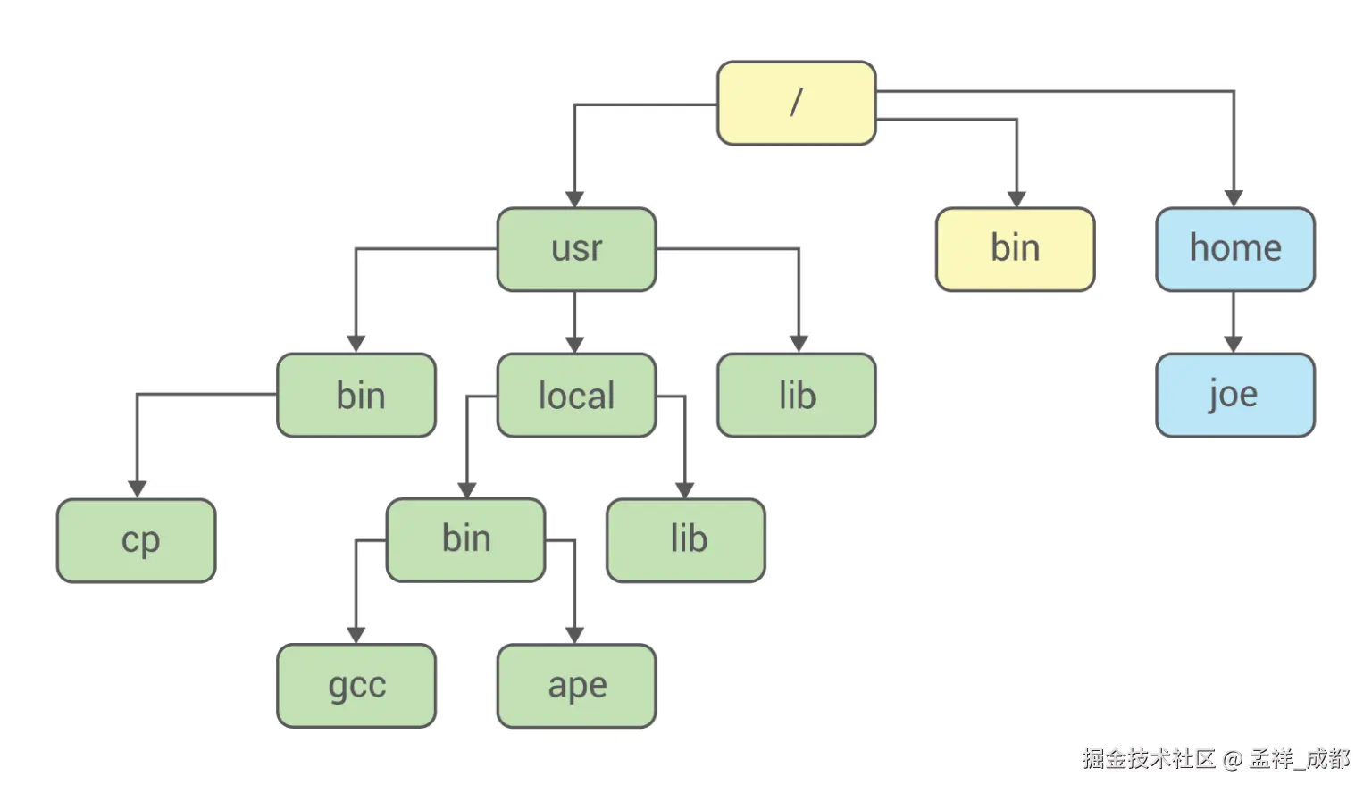 实际上 linux 也是用了障眼法做到的,如下图,首先假设下图是正常的某台 linux 机器的目录结构:
