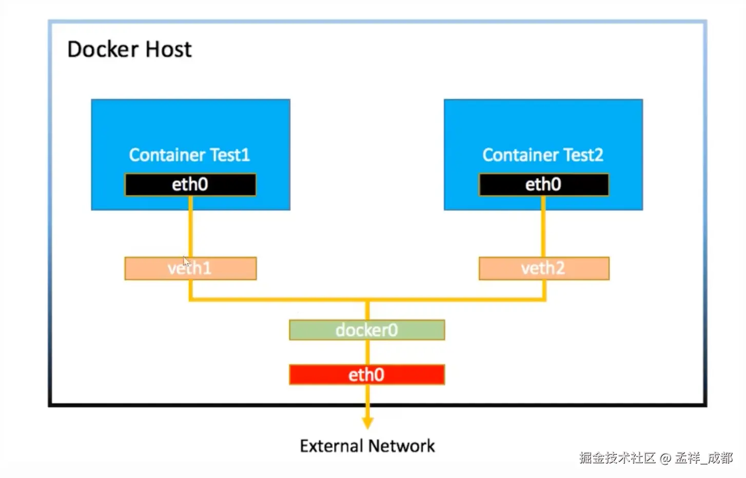 如下图,其实 docker0 是连接到我们真实物理机的网卡 eth0 来转发数据,从而让容器的数据通过 -> docker0 -> eth0 发送到计算机外部