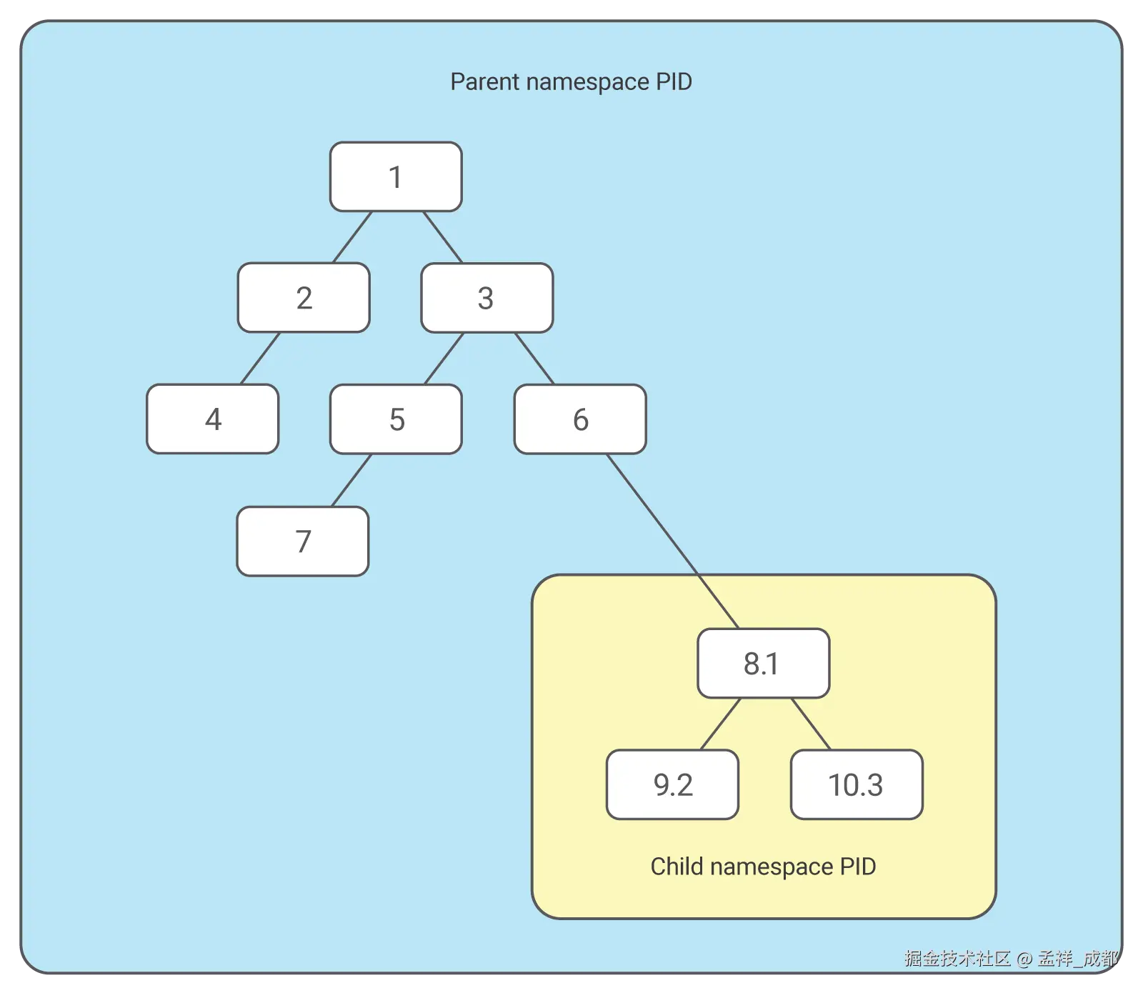 如上图,1、2、3、4、5、6、7、8、9、10,都是在物理机操作系统上的进程号(PID),而进入容器后,PID 8 是容器的主进程,linux 将其修改为进程号(PID)为 1,子进程也同样修改 PID,这样你在容器里,看到主进程是 PID 1,但是你退出容器,查看这个容器的进程号,就是 8。