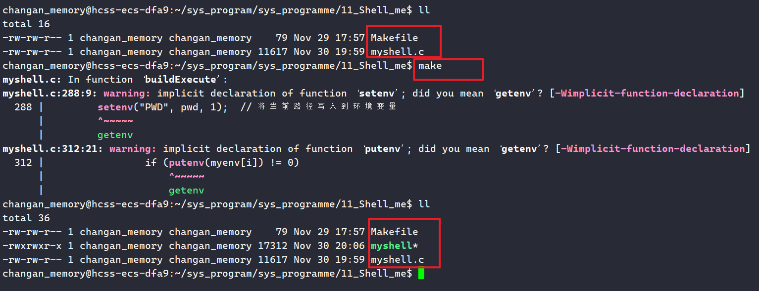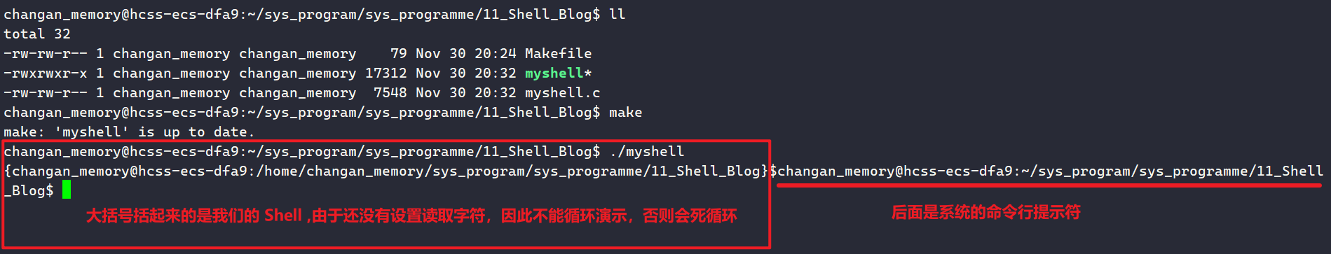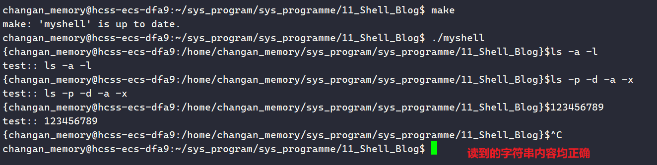 单文件版本的Makefile极其简单,输入make指令,myShell正确生成