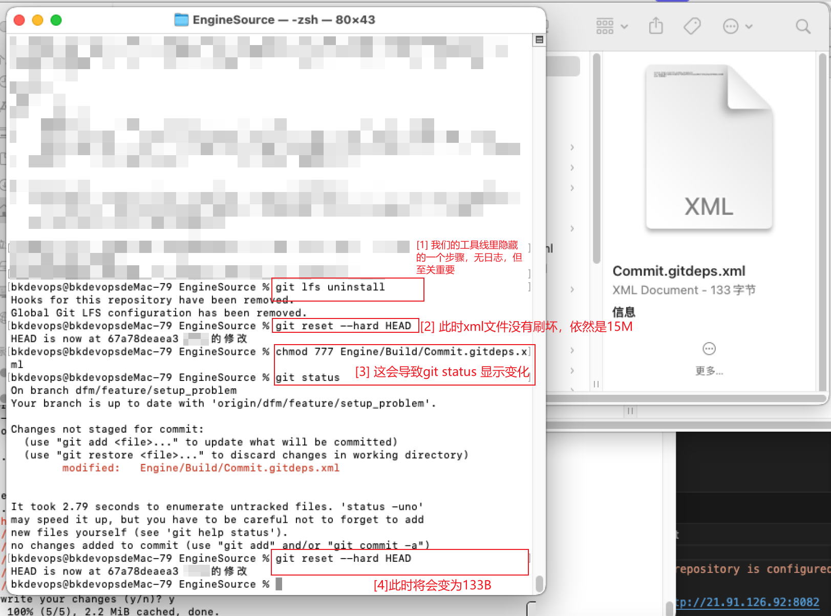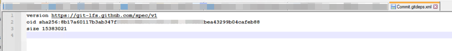 近期 Engine/Build/Commit.gitdeps.xml 添加到Git LFS文件后(操作过程见下文的方法1),出现了一个奇怪的问题------git 拉取后 Engine/Build/Commit.gitdeps.xml 成为3行的LFS指针文件,文件内容如图2,文件大小是133B ,导致后续的 git dependencies 失败,报错如日志3。这个问题只出现在iOS的构建机上。