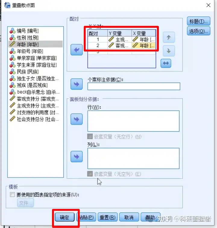 设置绘图变量如下,将"主观支持分"和"年龄"、"客观支持分"和"年龄"分别选入"Y-X对"对话框: