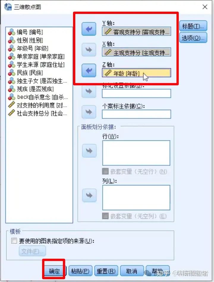 设置绘图变量,将"客观支持分""主观支持分"和"年龄"分别选入"Y轴"、"X轴"和"Z轴"对话框: