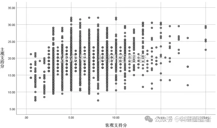 通过"简单分布散点图"绘制"主观支持分"和"客观支持分"的关系。