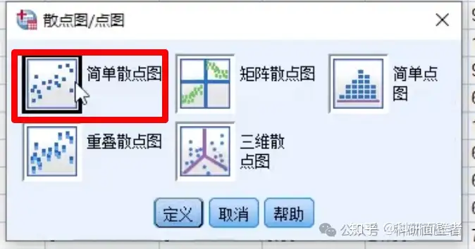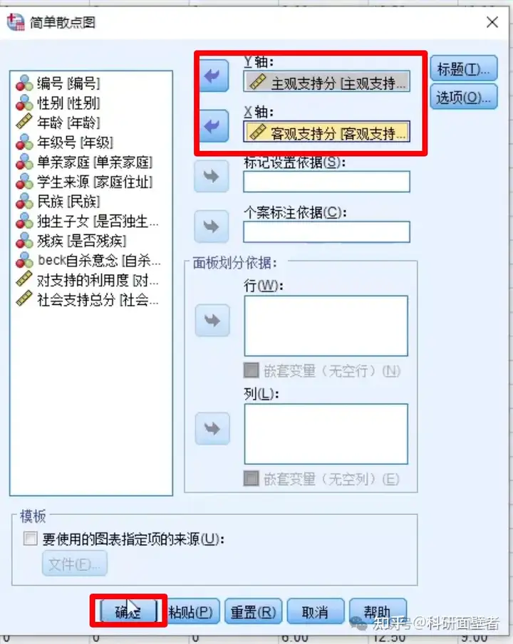 点击定义,设置要绘图的变量,分别将主观支持分和客观支持分纳入"Y轴"和"X轴":