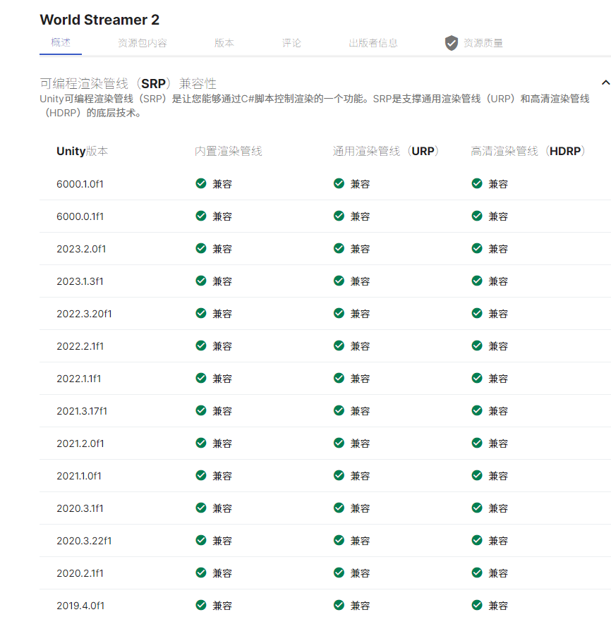 | 兼容 Unity 多渲染管线 (Built-in / URP / HDRP) | 虽然为地形 & world-streaming 设计,但支持不同渲染管线 (需导入支持包) 。 ([cgioo.com][6]) |