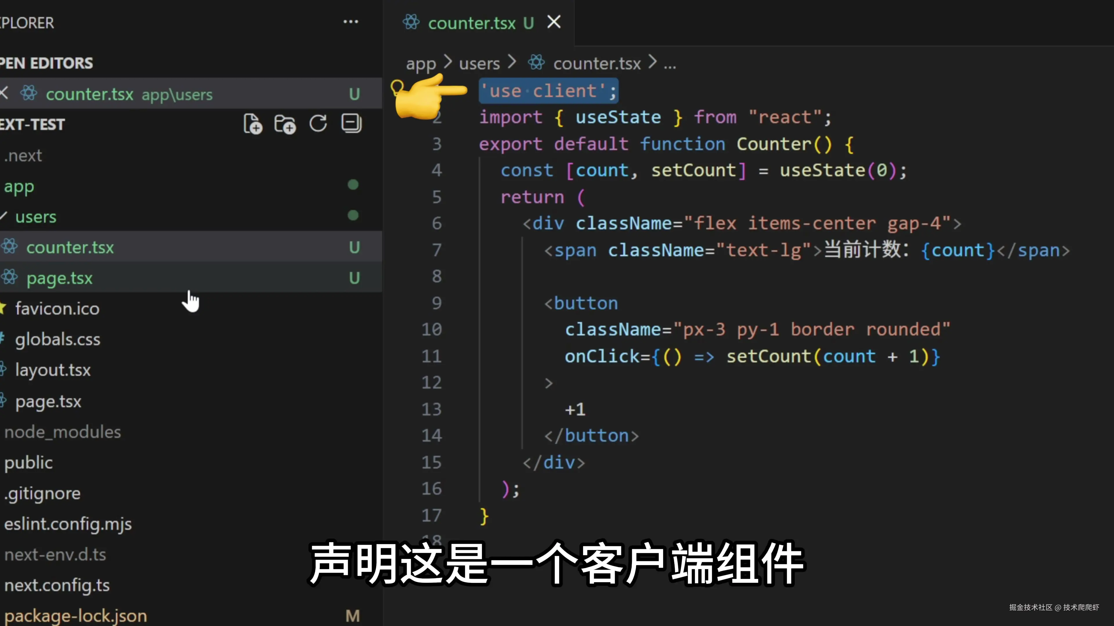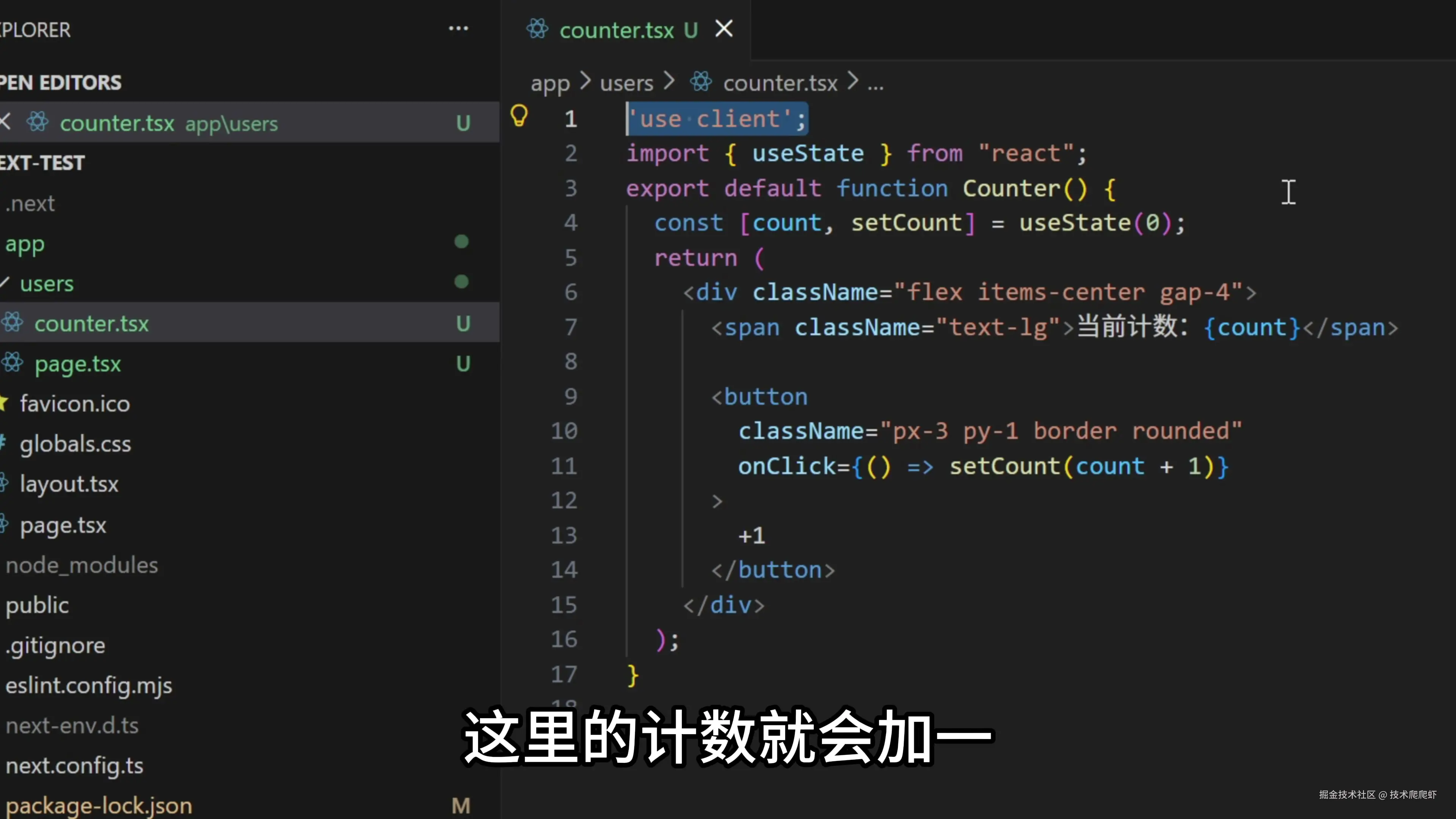 Next.js 除了支持编写服务器端组件 (RSC),当然也支持编写客户端组件。这里我们在 user 目录下面新建一个文件,叫 counter.tsx。我们新写了一个组件,这里有一个按钮,每点击一次,这里的计数就会加一。