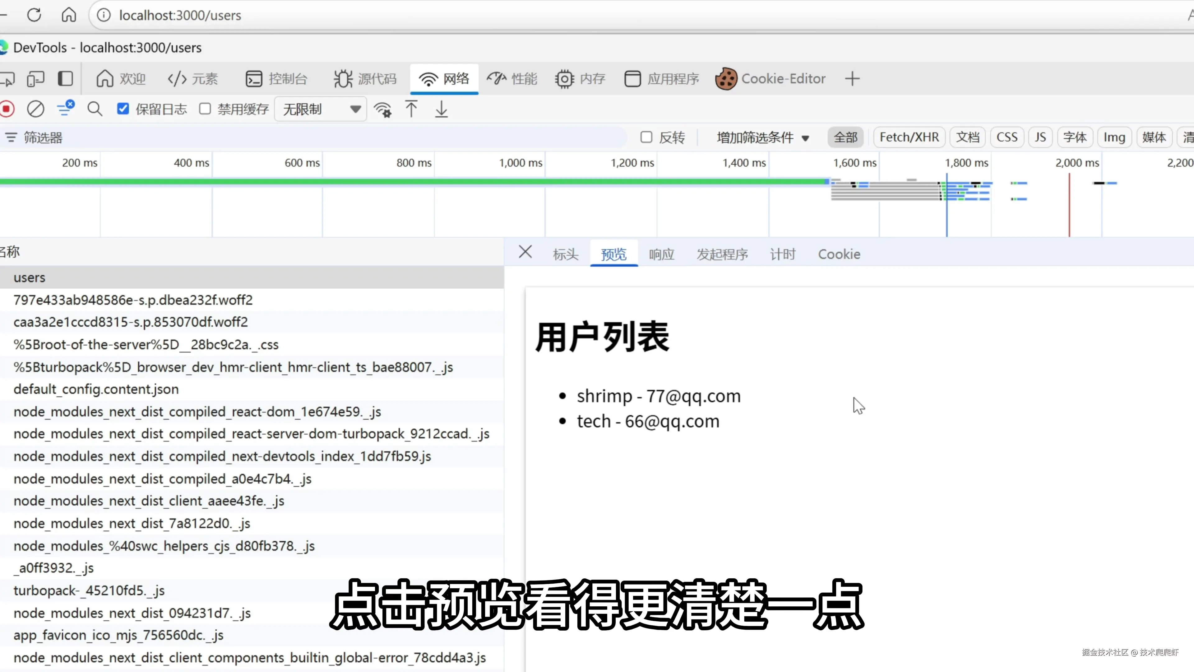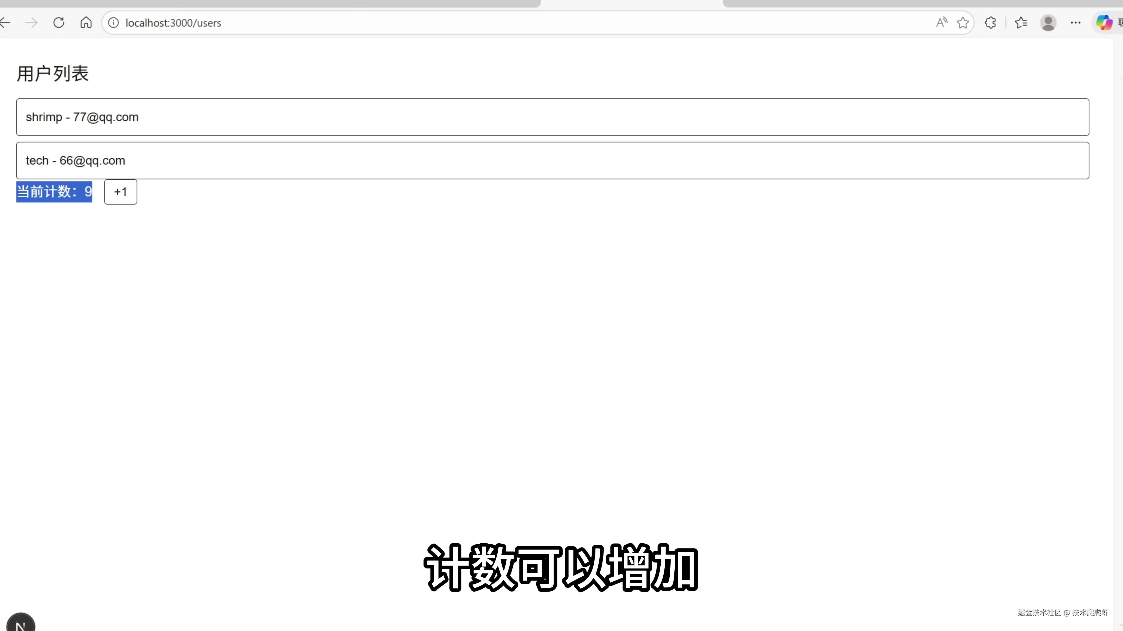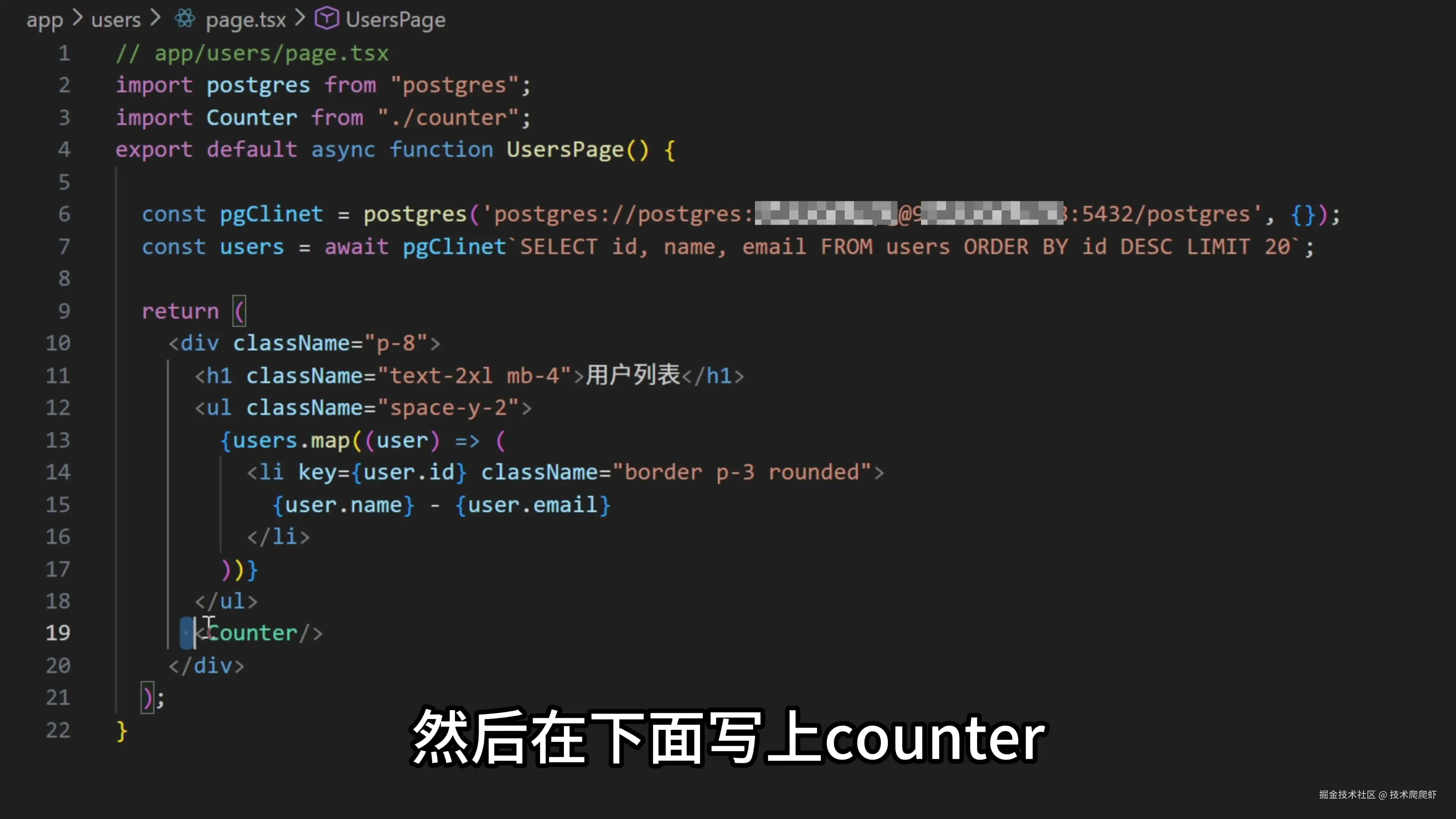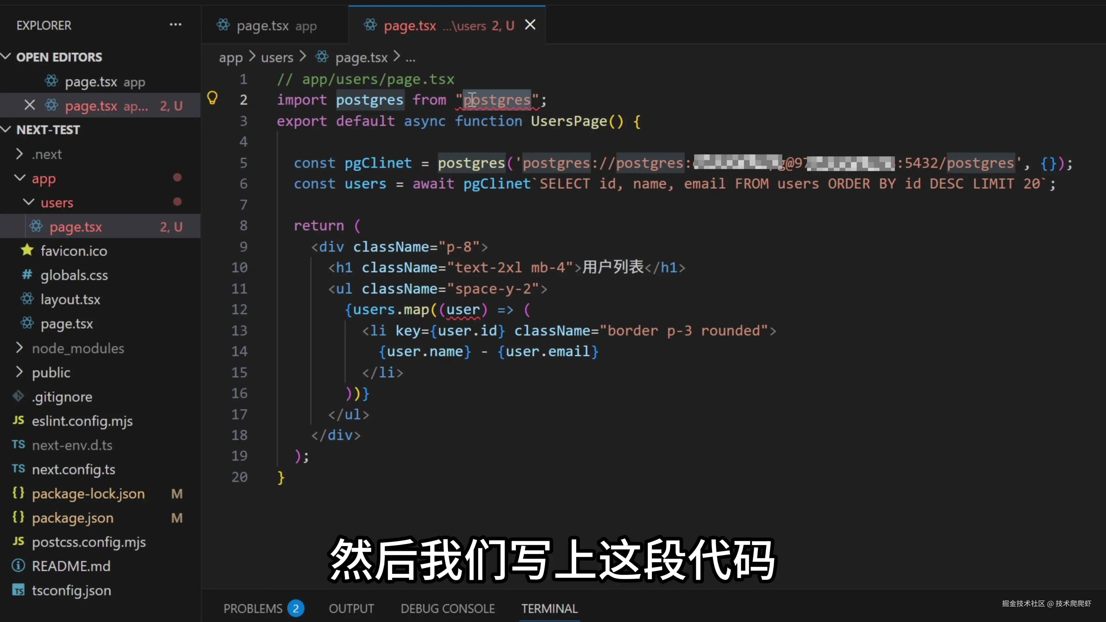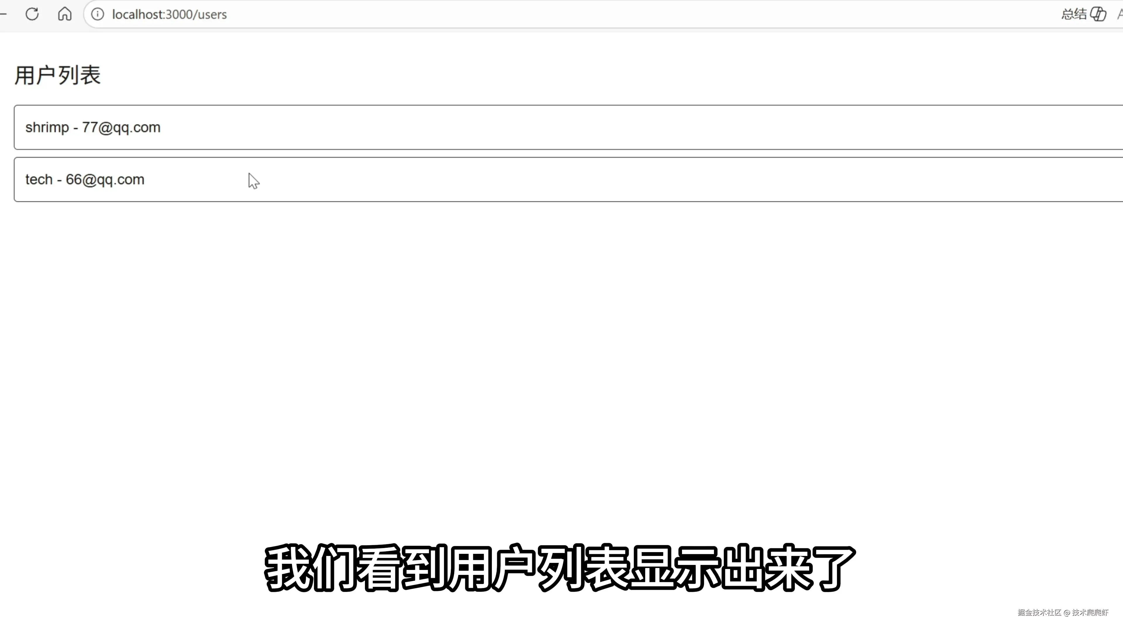 使用这段代码之前,我们需要先安装 postgres 的依赖。打开一个命令行窗口,执行 npm install postgres。依赖安装好了,我们来看一下这段代码的逻辑。这里新建了一个 postgres 的数据库连接,然后我们直接从数据库里面查询到了所有的用户,然后在下面的 React 组件里面遍历这个用户的数组,把用户的名字还有 Email 都组装好,最终组装成一个页面。我们来试一下,在浏览器这边,我们只需要输入跟目录同样的名字,也就是 /users,我们看到用户列表显示出来了。