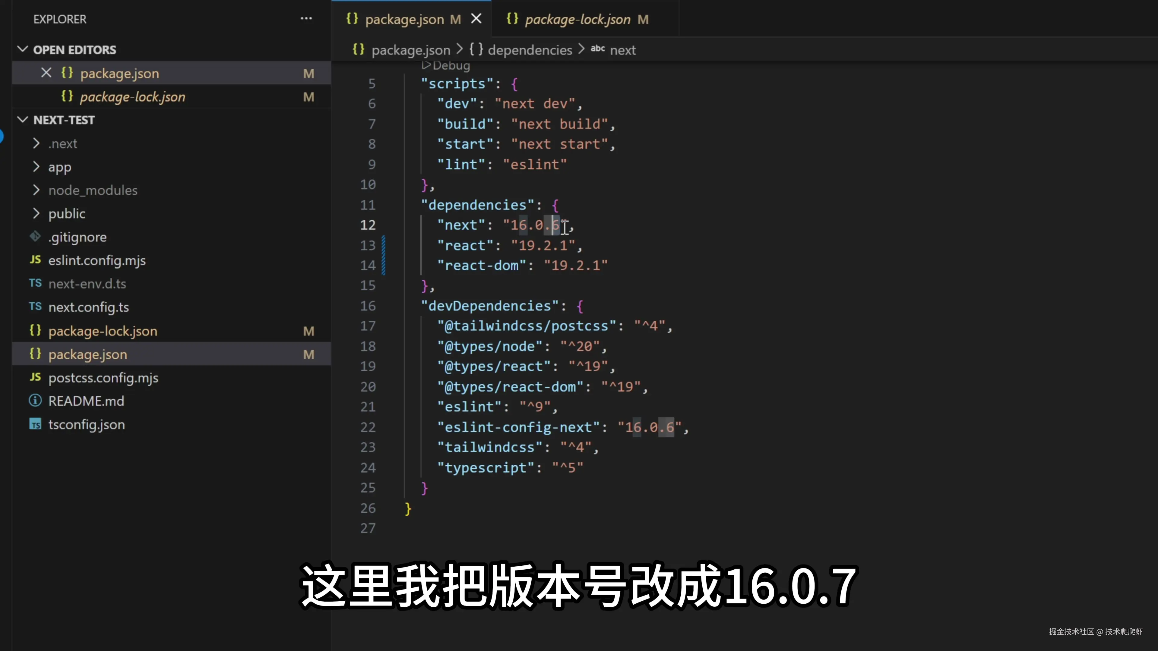 然后下面对于 Next.js 用户来说,16 版本应该升级到 16.0.7。这里我把版本号改成 16.0.7。