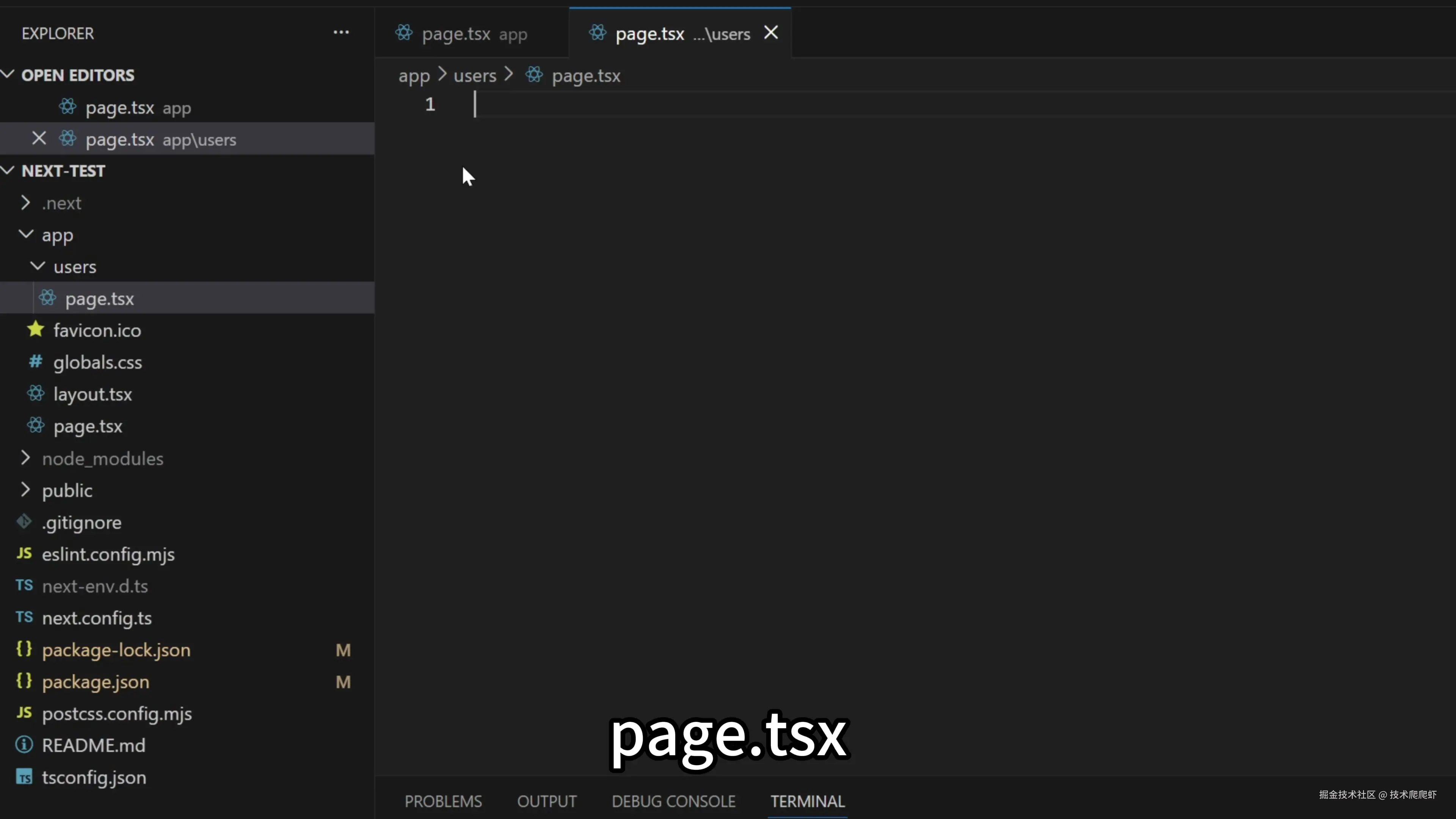 这里我在 app 目录下面新建一个文件夹叫 users,在文件夹里面再新建一个文件 page.tsx。