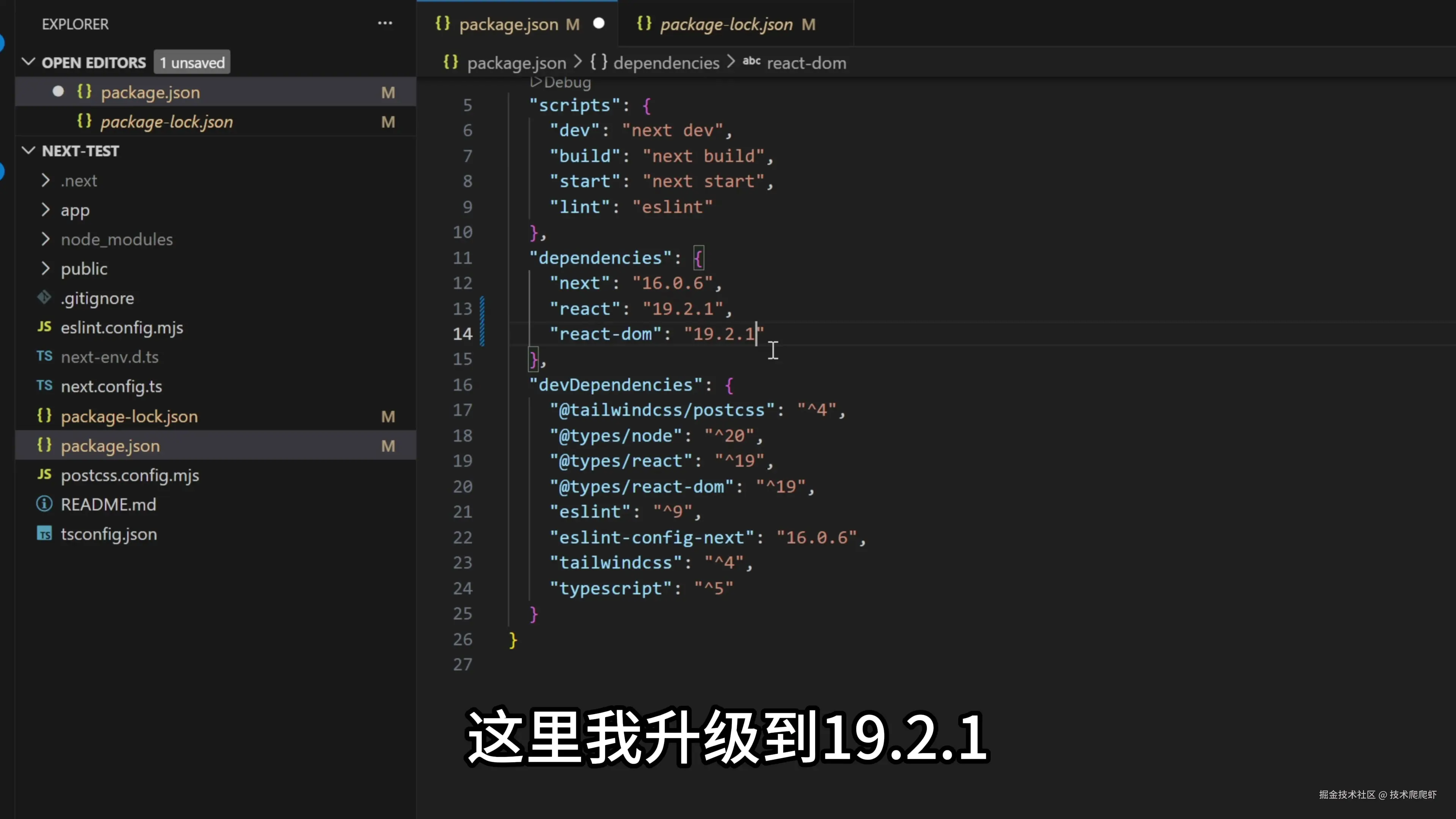 我们先把本地的这个项目的漏洞修补一下,然后我们再来介绍 Next.js 与 RSC。我们在官方的文档里面可以看到,React 的修复版本发布到了这三个版本,我这里是 19.2.0,这里我升级到 19.2.1。