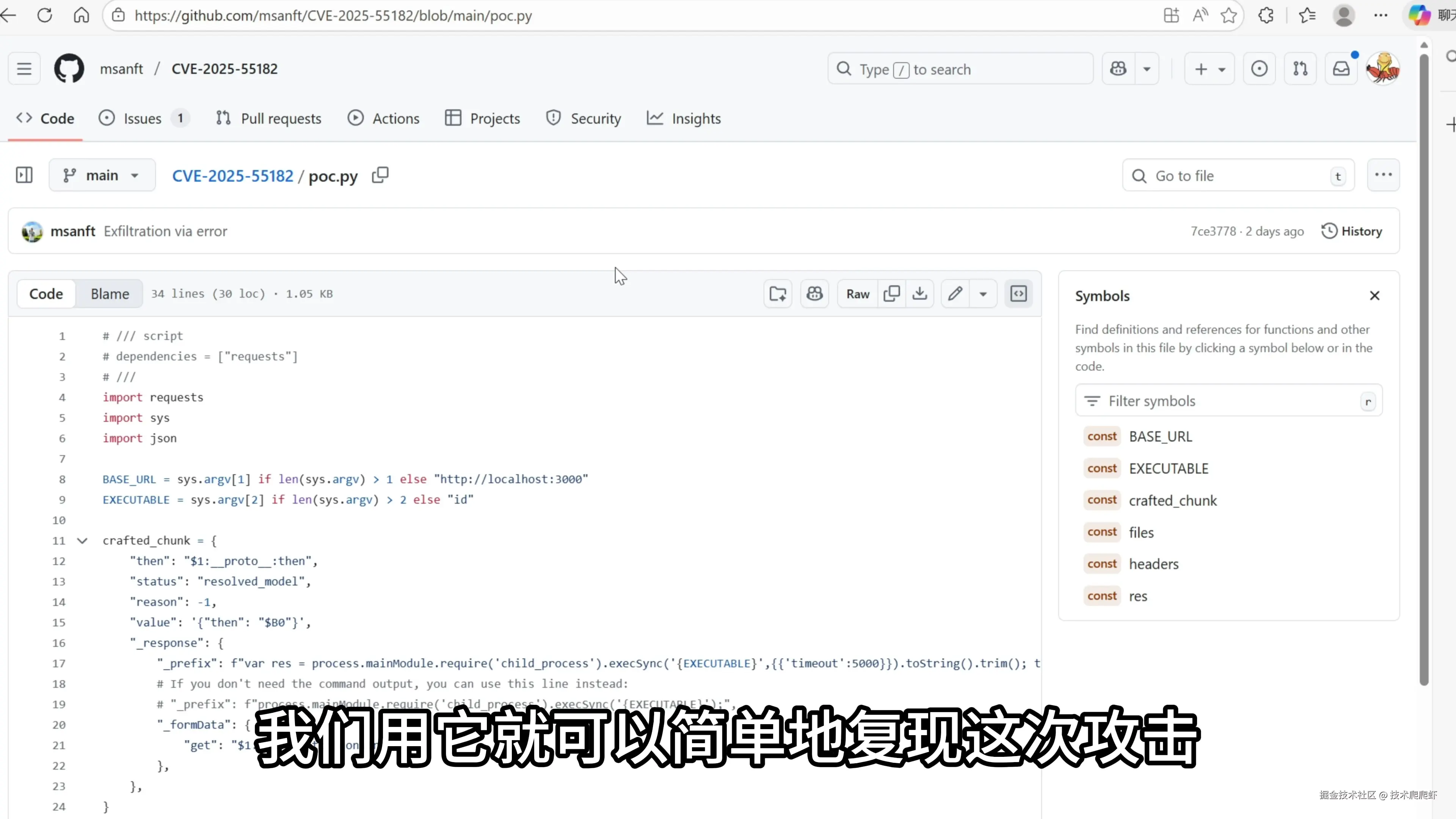 接下来我们来到 GitHub,找到跟这个漏洞同名的一个仓库,github.com/msanft/CVE-...