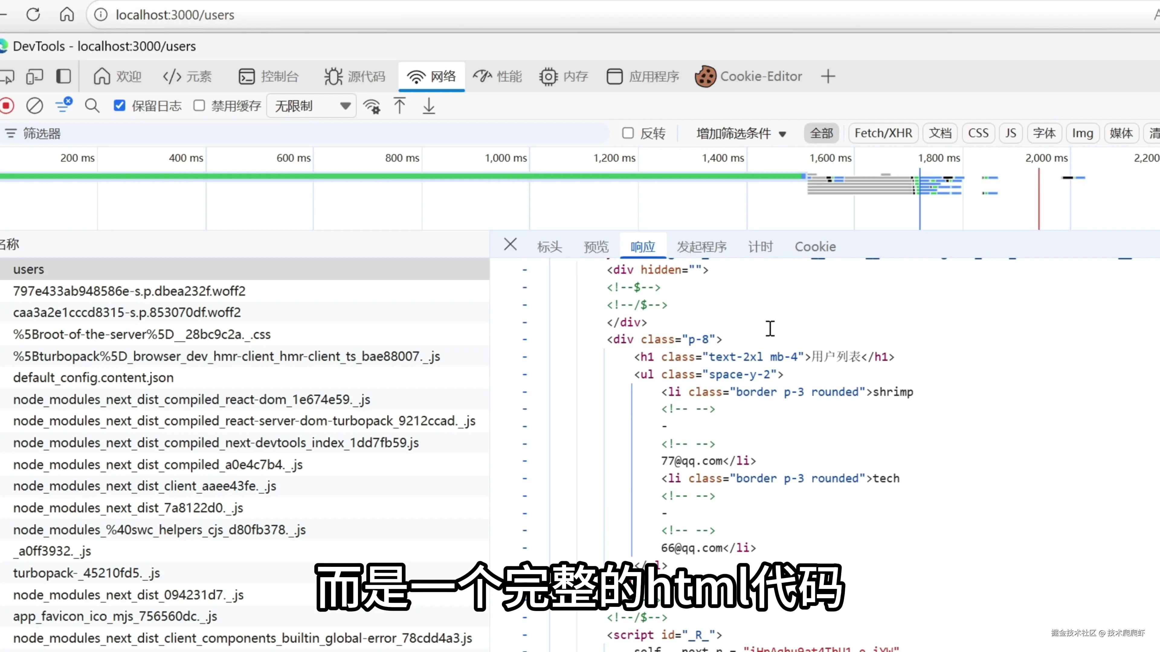 然后我们点击 F12 看一下浏览器的请求。我切换到网络选项卡,再刷新一下页面。我找到 users 这个请求,我们来看一下是怎么回事。我们看到,users 返回过来的不是一个 JSON 数据,而是一个完整的 HTML 代码。
