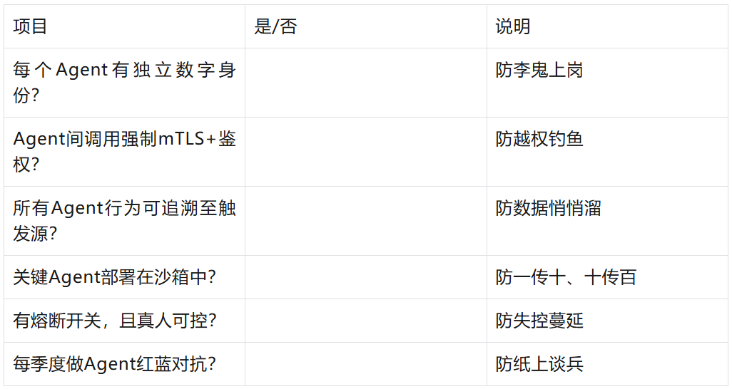 全打钩?恭喜,你已站在Agentic安全第一梯队。有空白?别慌------ "不怕慢,就怕站;不怕错,就怕瞒"。