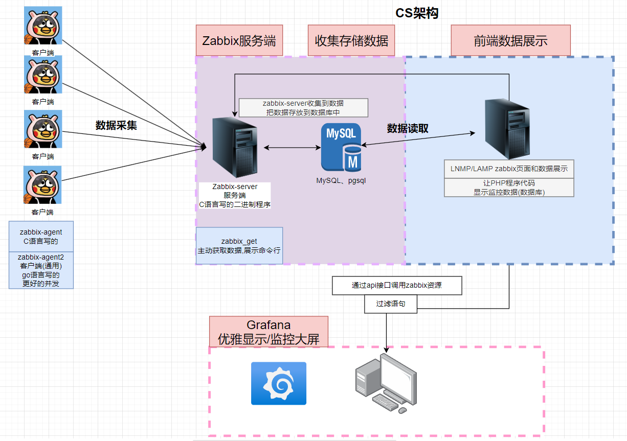 | Web 界面 | 可视化配置与展示入口 | 属于 Server 一部分,可与 Server 分机部署; 基于 Apache (Nginx)+PHP;5.0 后支持 LNMP,早期仅支持 LAMP |