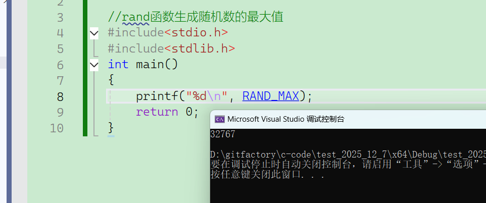 rand函数会返回一个伪随机数,这个随机数的范围是在0~RAND_MAX之间,,这个RAND_MAX的大小是依赖编译器实现的,但是大部分编译器上是