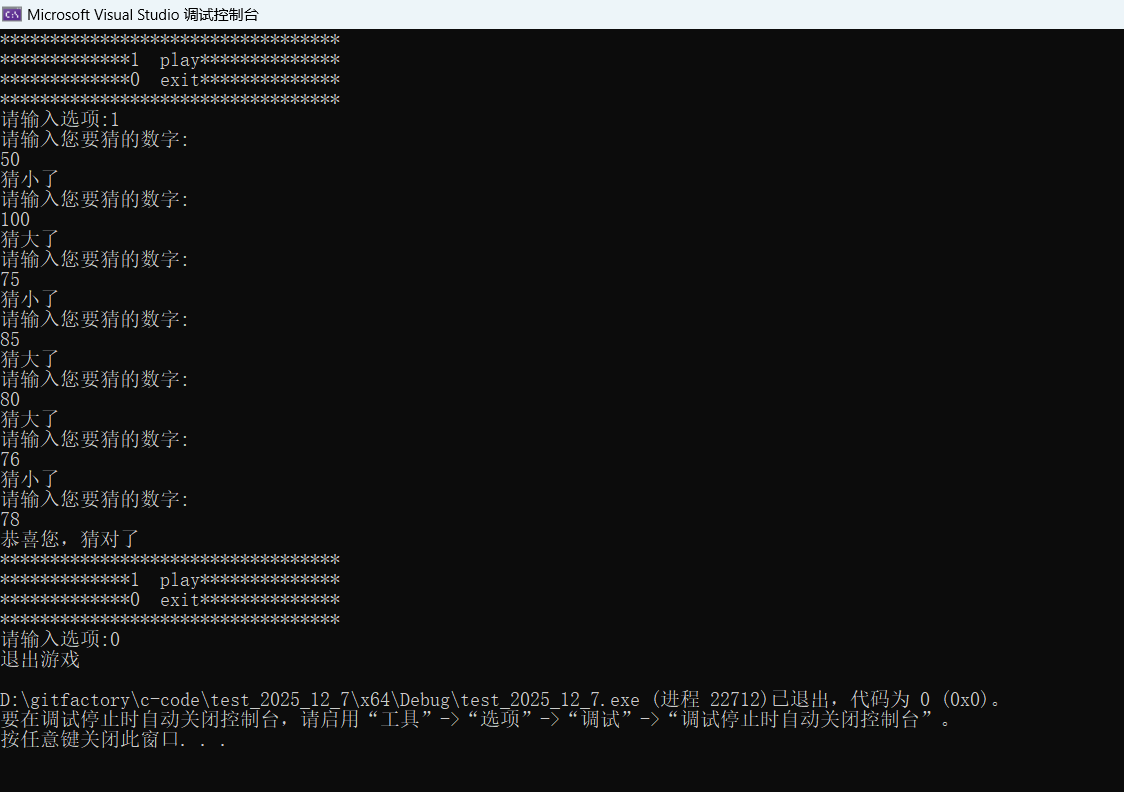 2、玩家猜数字,猜数字的过程中,根据猜测数据的大小给出猜大了或猜小了的反馈,直到猜对,游戏结束