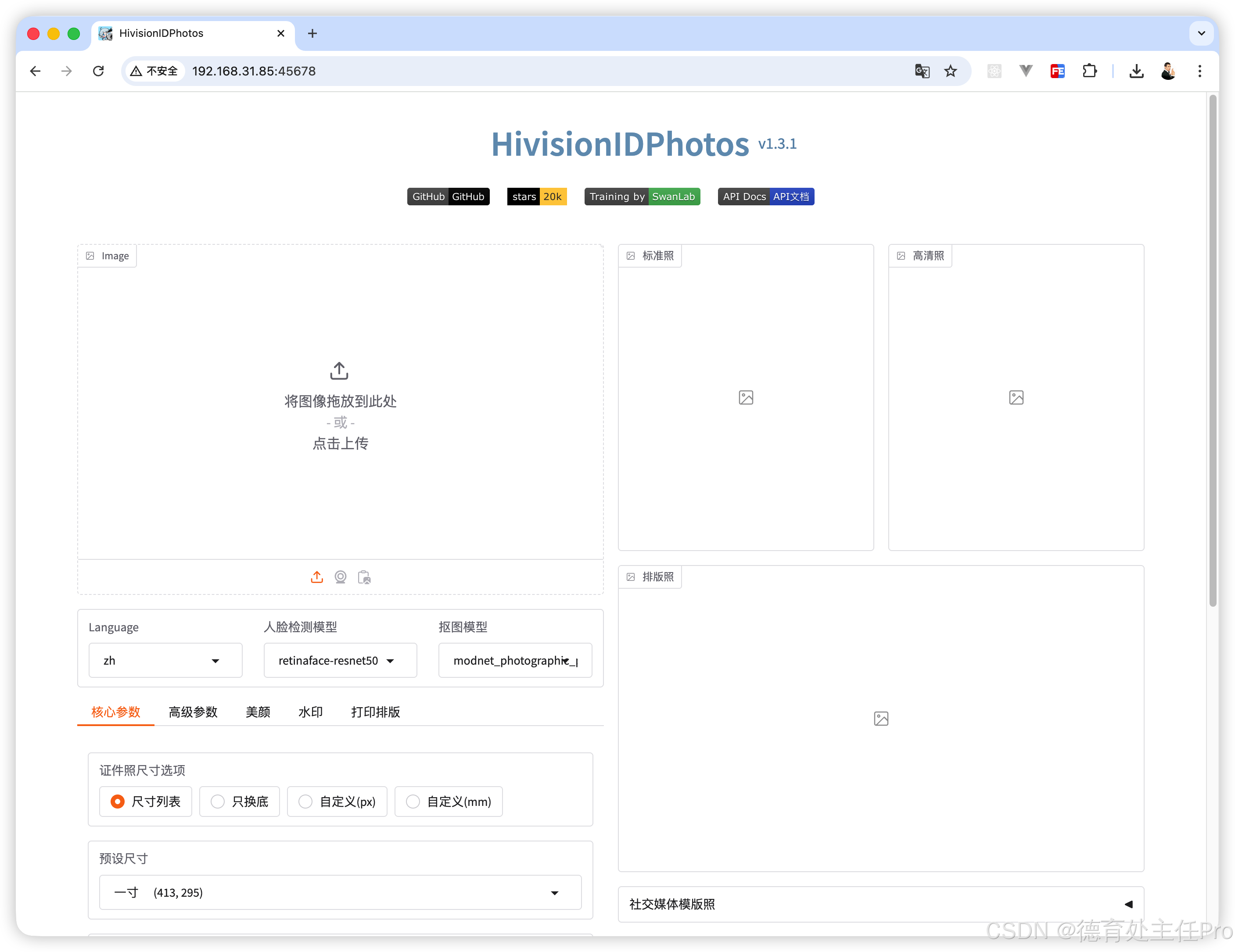 完成上面所有操作后,在浏览器输入【群晖的IP + 刚刚配置的端口号(45678)】就能使用 HivisionIDPhotos 了。
