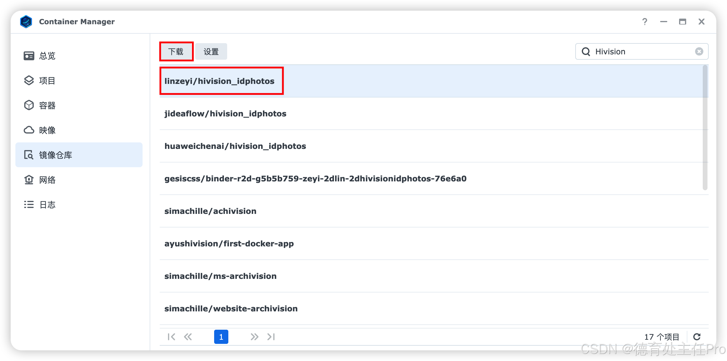 在"Container Manager"搜索"Hivision",下载红框这个。