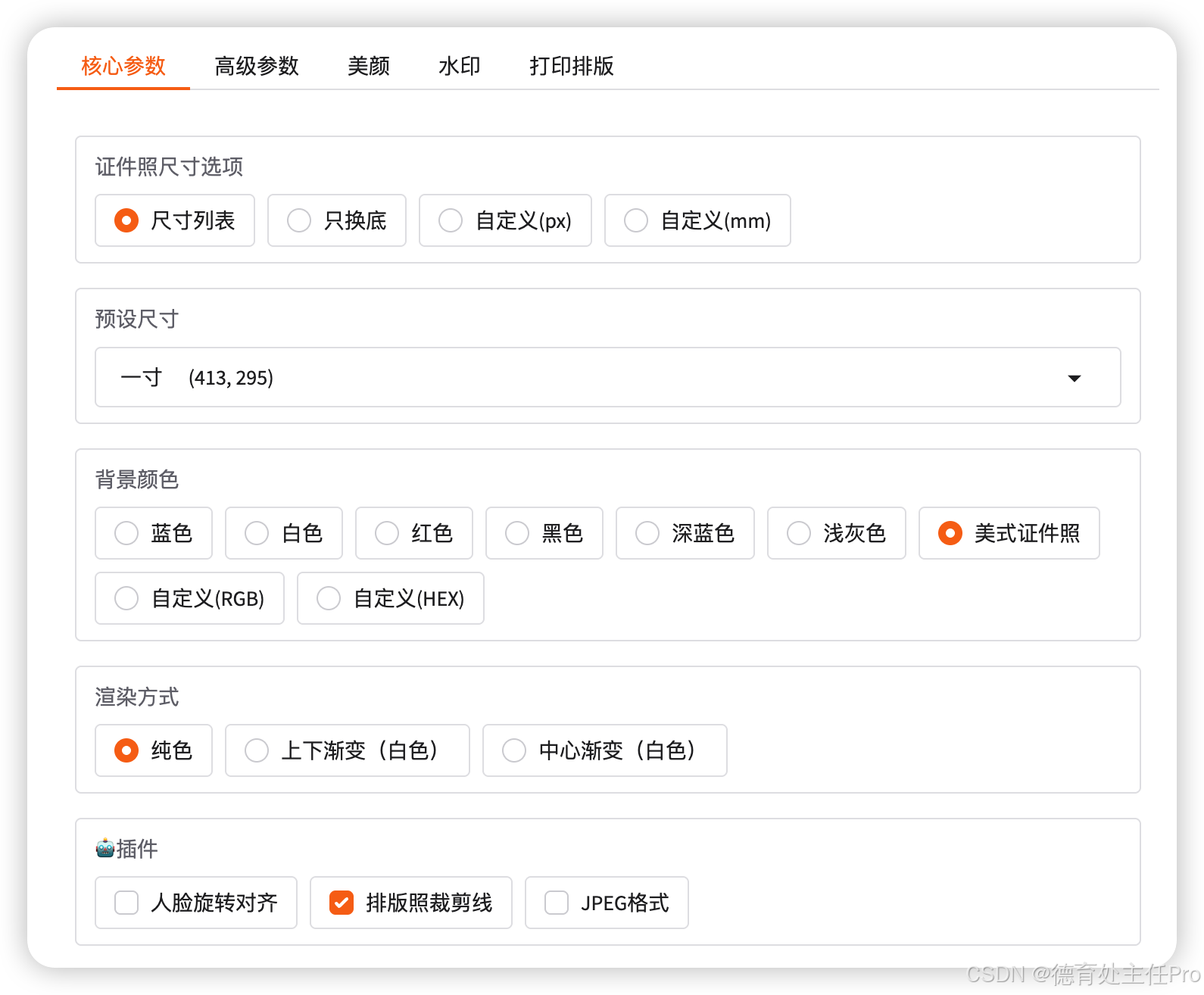 尽管看上去功能不太"完美",但生成证件照相关的功能都是具备的,比如设置背景颜色、美颜、加水印、生成常见的照片尺寸都有的~