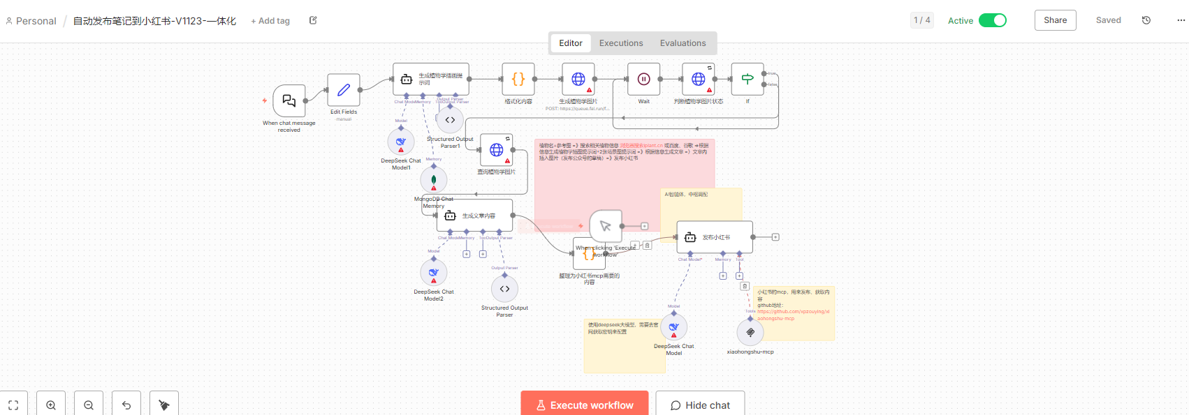 处理数据与路由 (Process & Route):使用 Set 节点整理数据格式,或使用 If 节点进行条件判断(例如:如果图片生成成功,则继续发布;否则,发送通知)。