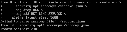 sudo isula run -d --name secure-container --cap-drop ALL --cap-add NET_BIND_SERVICE swr.cn-north-4.myhuaweicloud.com/library/alpine:latest sleep 3600