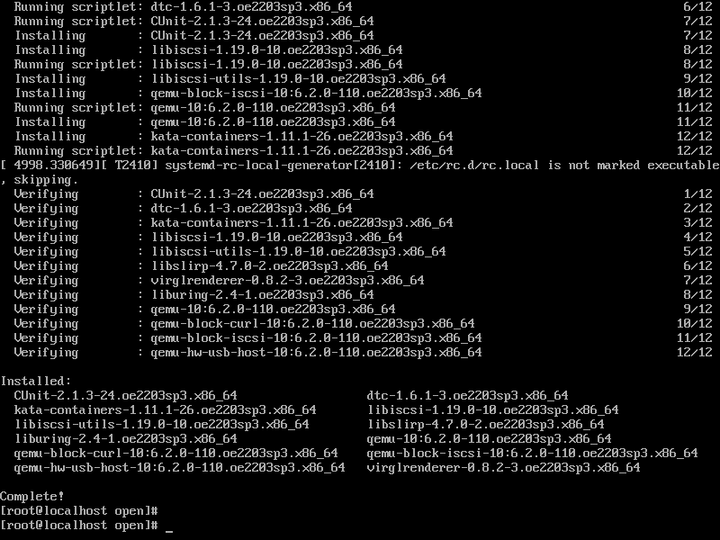 安装过程顺利完成,所有组件依赖关系自动解析,体现了openEuler在安全容器生态的完整性。