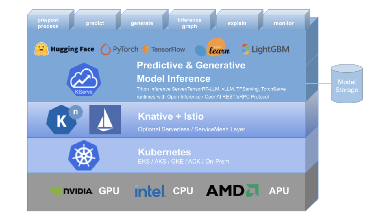 KServe(原 KFServing)是一个基于 Kubernetes 的云原生机器学习模型服务平台,旨在简化模型在生产环境中的部署、管理和扩展。它提供了一套标准化的接口和自定义资源定义(CRD),支持多种主流的推理框架后端,包括 TensorFlow Serving、TorchServe、Triton Inference Server 以及 Hugging Face 的 Transformer 服务等。KServe 的核心优势在于: