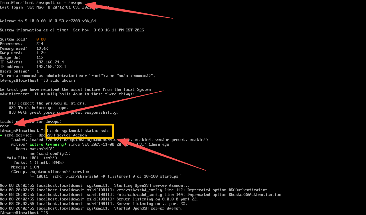 用户与权限配 置:创建专用的非 root 用户用于日常管理,并配置必要的权限。例如,可以创建一个 devops 用户并加入 wheel 组,以便执行管理员命令。同时,确保该用户拥有 sudo 权限,方便后续操作。