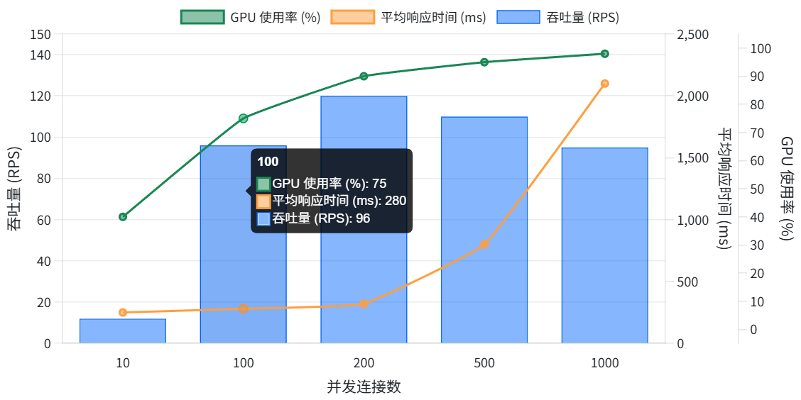 在低并发(10~100)时,平均响应时间保持在约 200~300 毫秒 左右,变化不大。这表明在轻负载下,服务能够快速响应请求,模型推理时间占主导。然而,当并发数超过 200 后,平均响应时间开始显著增加。在并发数为 500 时,平均响应时间上升到约 800 毫秒 ;当并发数达到 1000 时,平均响应时间超过 2 秒 。这表明在高并发下,服务出现了严重的排队和资源争用,导致请求处理延迟大幅增加。