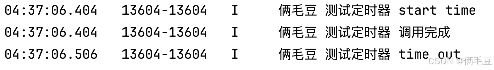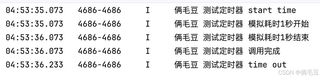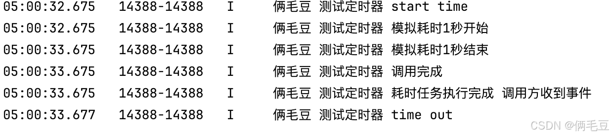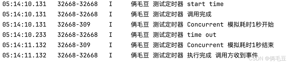 执行代码log如下图所示,可以看出,因为使用异步执行了耗时操作,定时器的超时时间,会在耗时操作之后(因为在同一个线程,且先被执行),但会在耗时操作执行完成后,立即执行(耗时操作1秒,定时器100毫秒)。