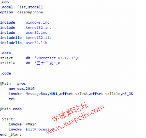 总结:结合上述介绍的Handle,读者可自行完成对本文附带的例子的分析。该例并不复杂,与原汇编代码基本可以说是一一对应的关系。稍微注意一下,对于函数调用,VMP3.X的处理方式是先退出虚拟机,同时将返回地址设为进入虚拟机的代码地址。
