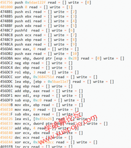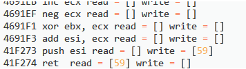 注意,栈中的数据被以DWORD为单位从0开始编号,read/write列表中包含每条指令读取/写入的栈变量序号。