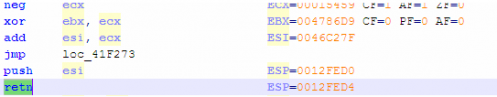 注意,不完全是以push esi/retn指令对的形式进行转移,还有以jmp esi实现流程转移的情况,事实上前者完全可以看成后者的一个变形。