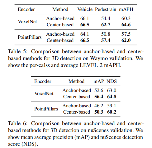 表 5 和表 6 对比了相同编码器下,Center-based 与 Anchor-based 方法的性能: