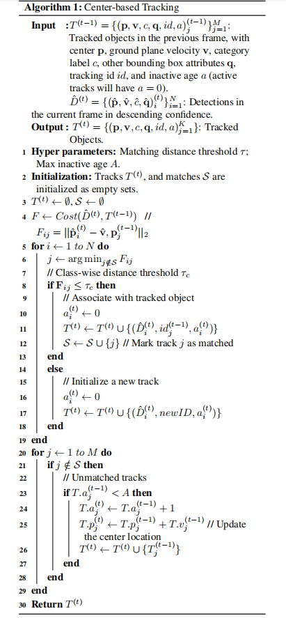 基于第一阶段预测的中心点和速度,CenterPoint 采用贪心最近点匹配策略实现跟踪,算法流程如 Algorithm 1 所示:
