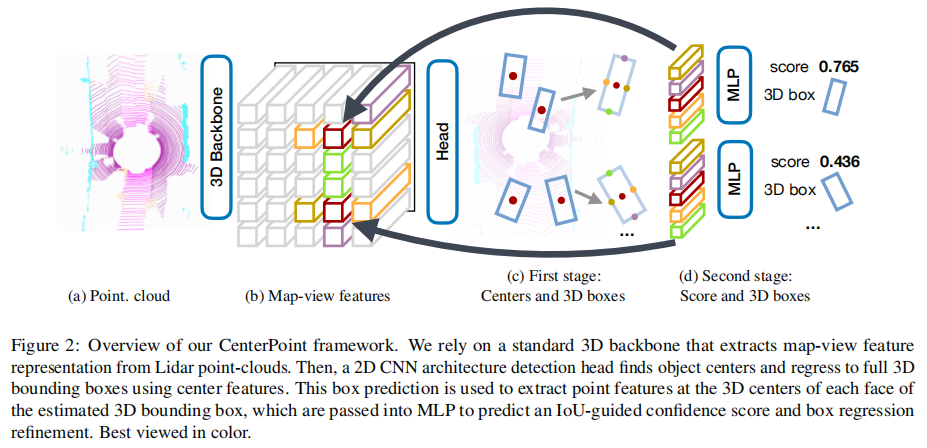 CenterPoint 采用两阶段架构:第一阶段检测中心点并回归目标属性;第二阶段利用边界框表面特征精炼预测结果。整体流程如图 2 所示。